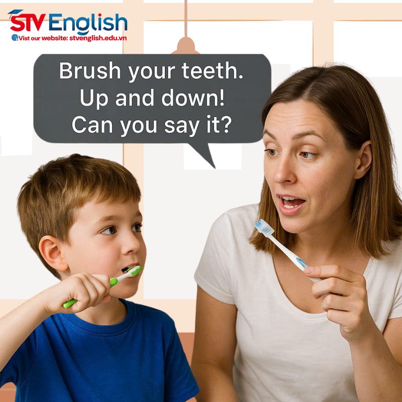 - Khi đánh răng: “Brush your teeth. Up and down! Can you say it?”