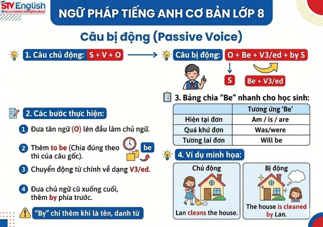 Học sinh yếu thường sợ câu bị động vì phải nhớ quá nhiều biến thể. Tuy nhiên, các em chỉ cần nắm vững "Sơ đồ chuyển đổi" dưới đây để giải quyết mọi bài tập.