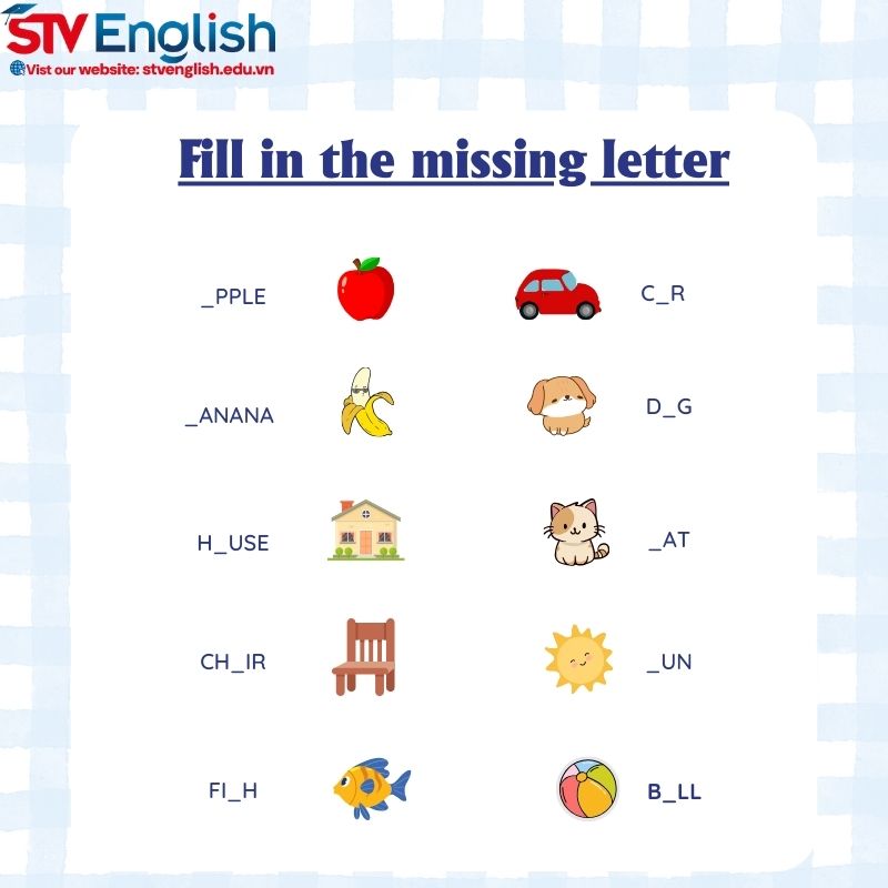 Bài tập 2: Điền chữ cái còn thiếu Hãy điền chữ cái còn thiếu vào từ dưới đây: