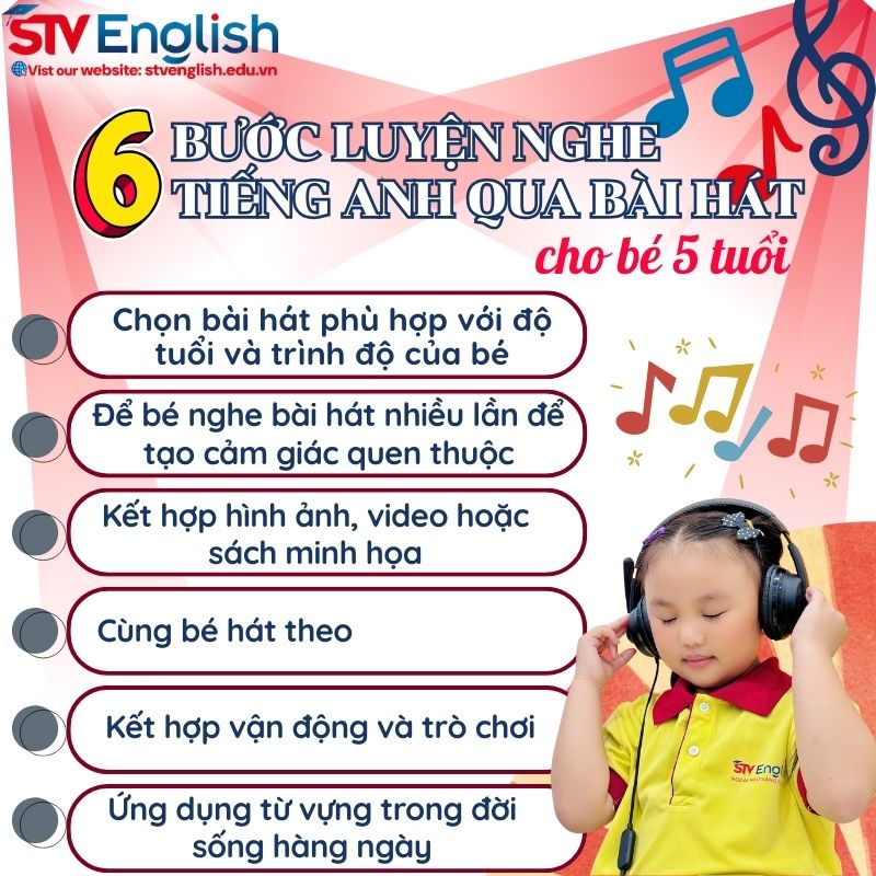 Luyện nghe tiếng Anh cho bé 5 tuổi qua bài hát là một phương pháp học hiệu quả, tự nhiên và mang tính giải trí cao. Âm nhạc không chỉ giúp bé làm quen với từ vựng và cách phát âm, mà còn tạo dựng thói quen học tập tích cực ngay từ nhỏ. Với sự đồng hành của cha mẹ và giáo viên, những bài hát tiếng Anh cho bé 5 tuổi sẽ không chỉ là lời ca mà còn là cây cầu dẫn dắt trẻ đến thế giới ngôn ngữ mới một cách vui vẻ và tự tin.