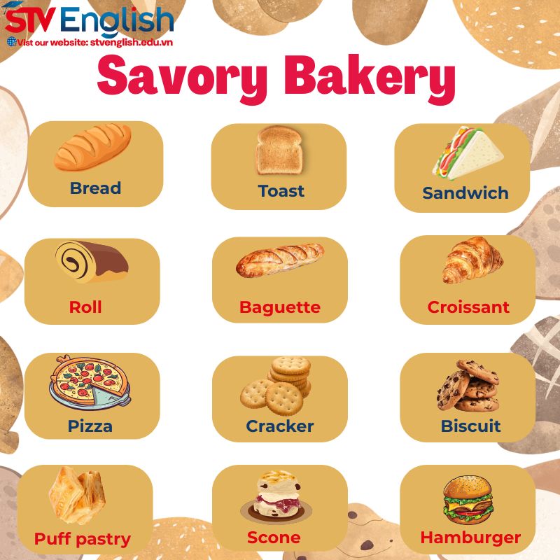 Bánh mặn không chỉ là món ăn nhanh tiện lợi mà còn giúp bé học thêm từ vựng tiếng Anh thú vị qua từng loại bánh quen thuộc hàng ngày!