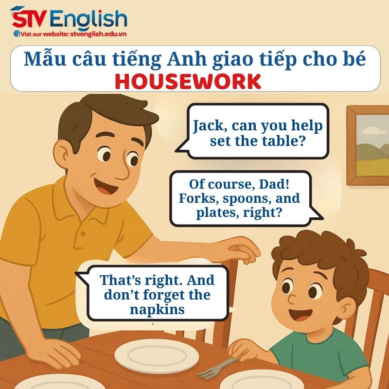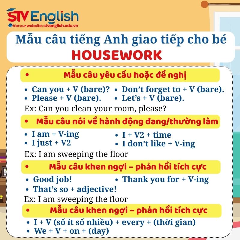 Sau khi đã nắm vững từ vựng tiếng Anh giao tiếp cho bé theo chủ đề Housework, bước tiếp theo quan trọng là luyện nói theo mẫu câu cụ thể. Đây là cách giúp trẻ giao tiếp tiếng Anh cho trẻ em hàng ngày một cách tự nhiên và phản xạ nhanh hơn trong ngữ cảnh thực tế.