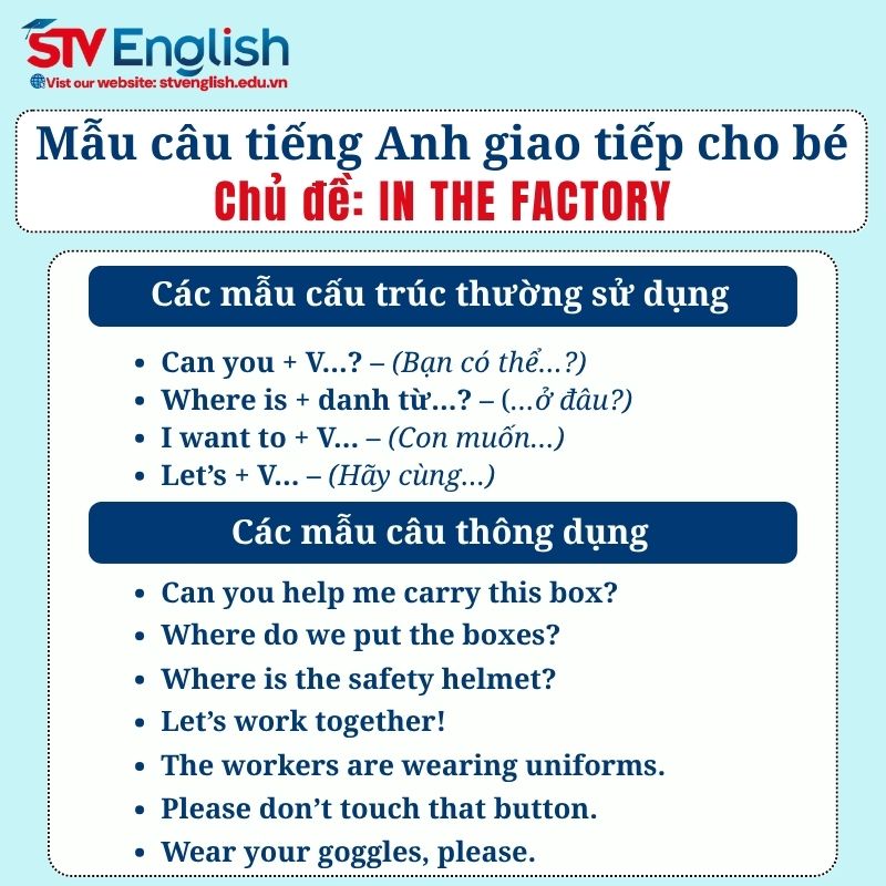 - II. MẪU CÂU GIAO TIẾP TIẾNG ANH CHO BÉ VỀ CHỦ ĐỀ "IN THE FACTORY"