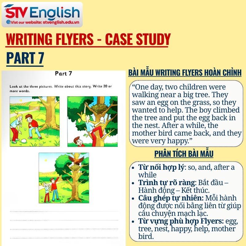 Mô tả ngắn: Sau khi hiểu đề, học sinh cần thực hành luyện viết câu Flyers thường xuyên để hình thành phản xạ kể chuyện tự nhiên.
