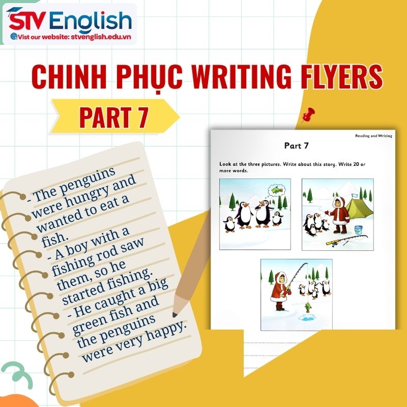 Trong phần Writing Flyers Part 7, thí sinh cần viết một đoạn văn ngắn dựa trên 3 bức tranh. Nhiều học sinh có thể nhận diện được hình ảnh, nhưng khó khăn khi xâu chuỗi ý tưởng thành một câu chuyện mạch lạc.